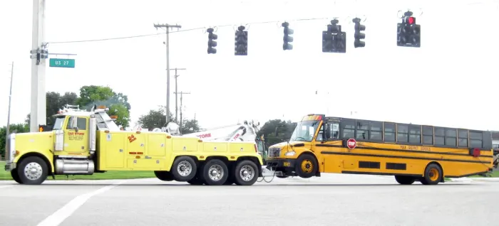 Буксировка автобусов с помощью частичной погрузки осуществляется следующим образом. С помощью стального крана или лебедки передняя часть буксируемого транспорта поднимается специальными захватами грузового эвакуатора. Здесь она надежно крепится цепями, дабы избежать повреждений при транспортировке.