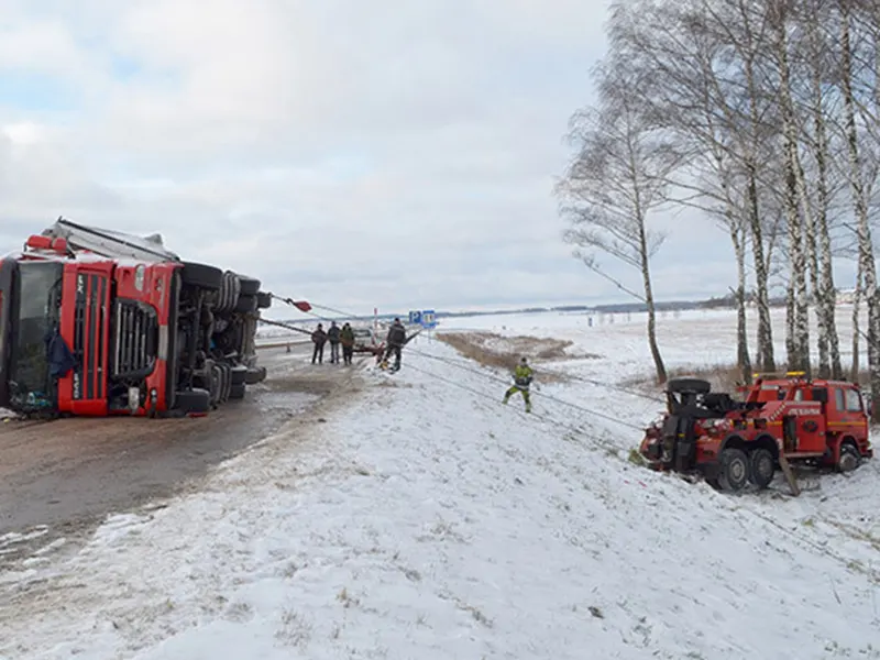 А вот мы уже и на месте. Время за разговорами пролетело незаметно. Ребята сразу же начинают готовиться к поднятию грузовика. Товар распаковать нельзя, поэтому будем работать с увеличенным в два раза весом – почти 40 тонн поднять надо. И это при том, что вес спецтехники не дотягивает даже до 20 тонн! При первых попытках подтянуть фуру ребята видят, что есть риск ее схождения в кювет еще больше – автомобиль может пойти кувырком, задавив при этом и маленький эвакуатор.